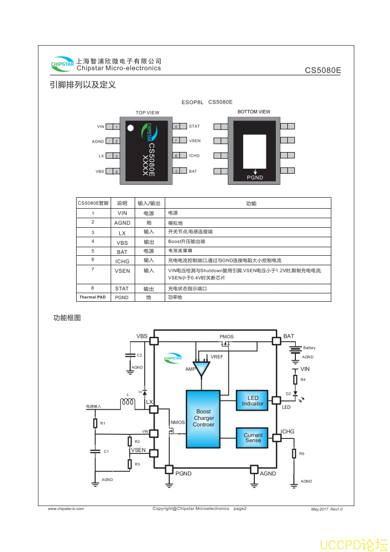 C5080E提供瞭纖小的ESOP8L封裝類型供客戶選擇其額定的工作溫度範圍爲-40至85℃。