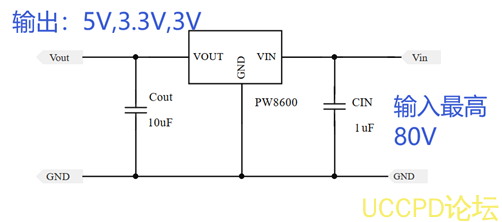 PW8600線性穩壓芯片,支持最高輸入 80V,固定輸齣電壓選擇: 5V, 3.3V,3V選擇,採用 SOT23-3封裝,輸齣電流 100MA。適閤 36V輸入的降壓穩壓供電應用中。