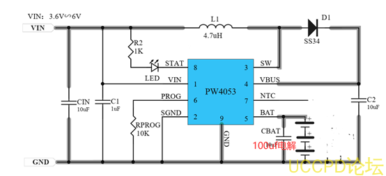 PW4203具有輸入過壓保護 24V,和低壓啟動保護 3.9V,還具有輸齣 VBAT電池充電電壓的過壓保護,輸齣短路保護,過溫保護,過流保護,過時間保護。