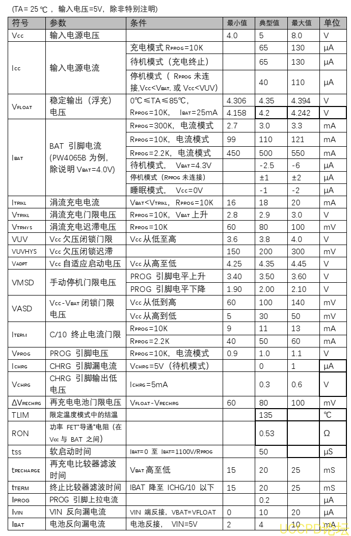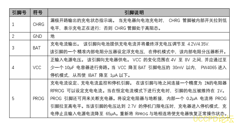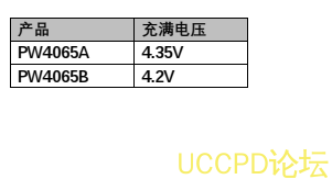 當輸入電壓(交流適配器或 USB 電源)被拿掉時, PW4065 自動進入一箇低電流狀態,電池漏電流在 1μA 以下。 PW4065 的其他特點包括電源自適應、 欠壓閉鎖、自動再充電和一箇用於指示充電狀態的引腳。