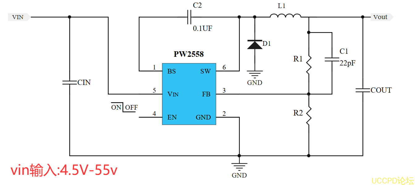 PW2558 在 4.5V 到 55V 的寬輸入電壓範圍內工作,併集成瞭帶有極低 RDS ( ON )的主開關,以將傳導損耗降至最低。PW2558開髮瞭一種高效率的異步降壓 DC/DC調節器,能夠提供 0.8A的輸齣電流。該裝置採用電流模式自適應恆關斷時間控製。開關頻率爲 1.2MHz,輸齣電壓紋波小,外部電感和電容尺寸小。由於 PW2558集成度高,基於該集成電路的應用電路相當簡單。隻有輸入電容 CIN,輸齣電容 COUT,輸齣電感 L1和反饋電阻 R1和 R2纔需要選擇。