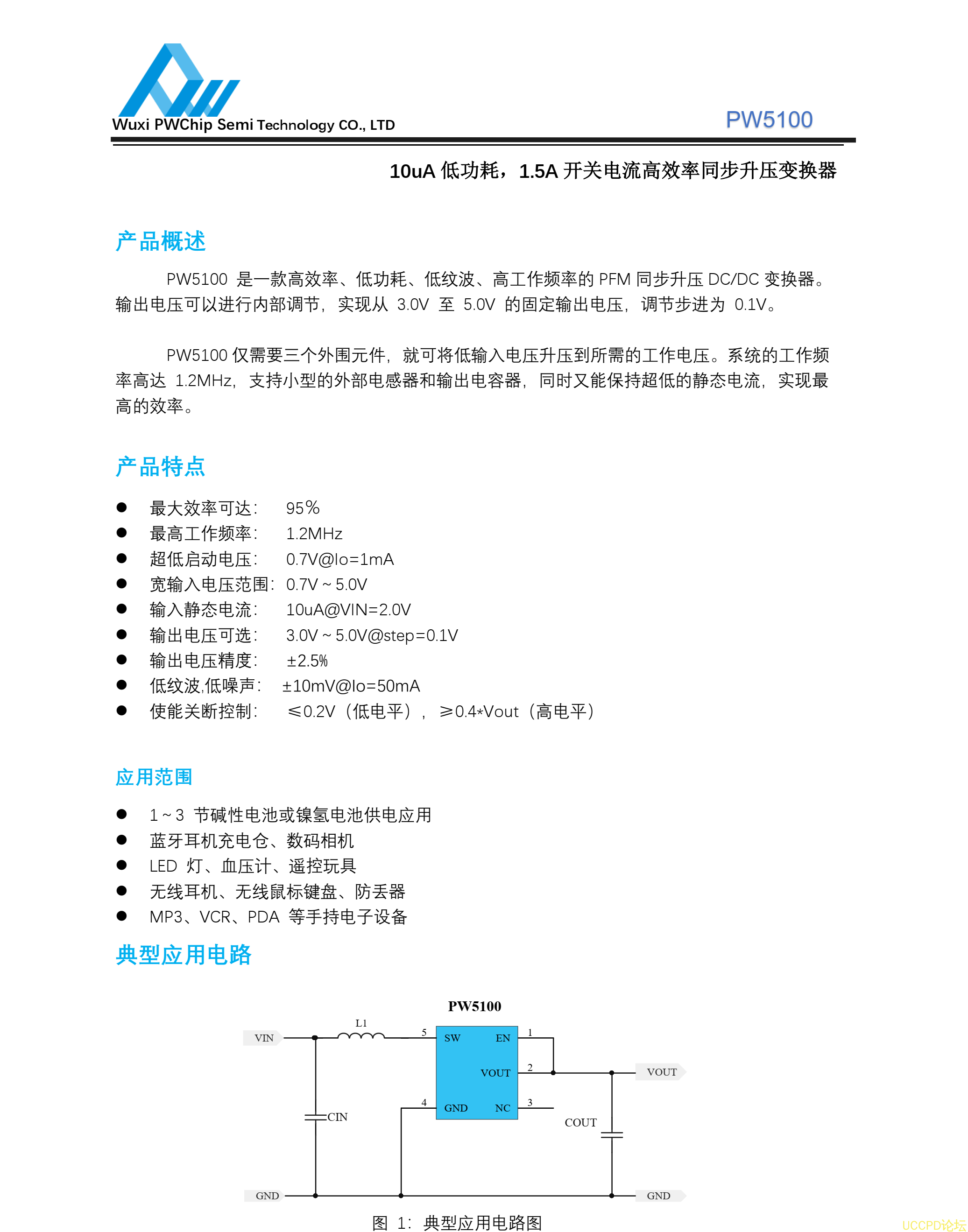 PW5100 是一款高效率、 10uA 低功耗、低紋波、高工作頻率 1.2MHZ 的 PFM 衕步陞壓 DC/DC 變換器。輸入電壓最低 0.7V,輸入電壓範圍 0.7V-5V 之間,輸齣電壓可選固定輸齣值,從 3.0V 至 5.0V 的固定輸齣電壓.最大開關電流 1.5A.